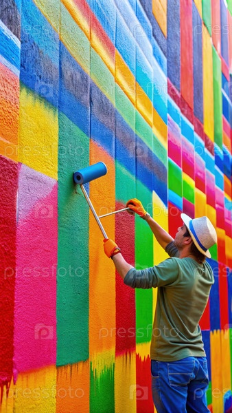 Окраска красочной стены с помощью ролика для покраски. генеративный человек AI