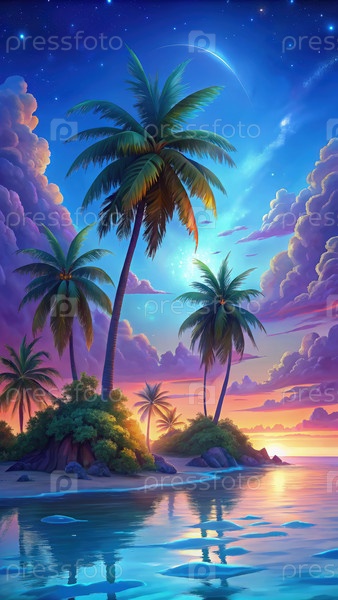 Закат солнца на тропическом острове с пальмами и спокойной водой