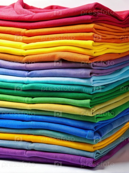 Куча красочных футболок, сложенных и расположенных в радужном рисунке