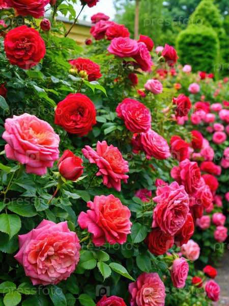 Роскошный сад, изобилующий розовыми и красными цветами