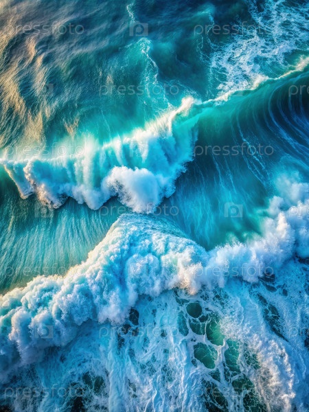 Вид с воздуха на бирюзовые волны океана, разбивающиеся утром под солнцем