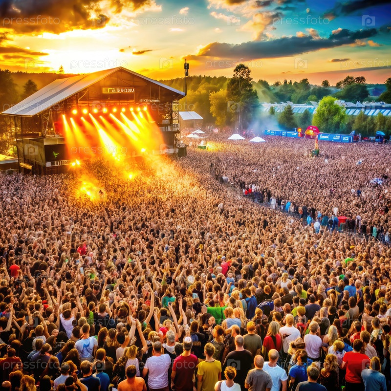 Большая толпа наслаждается выступлением музыкального фестиваля на закате