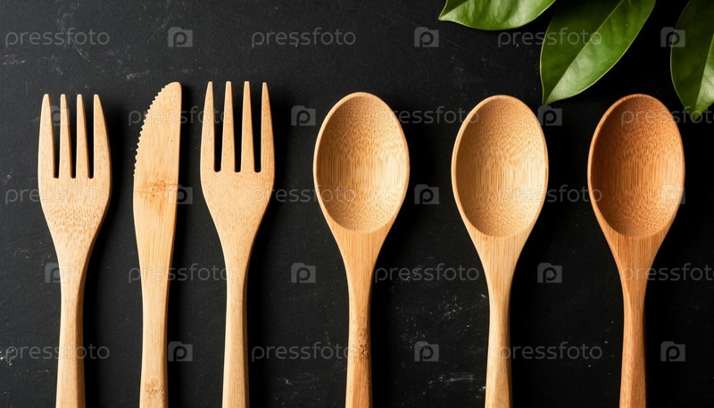 Деревянные столовые приборы - ложки и вилки на темном фоне