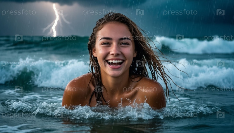 Красивая счастливая девушка с мокрыми волосами в море во время грозы и шторма