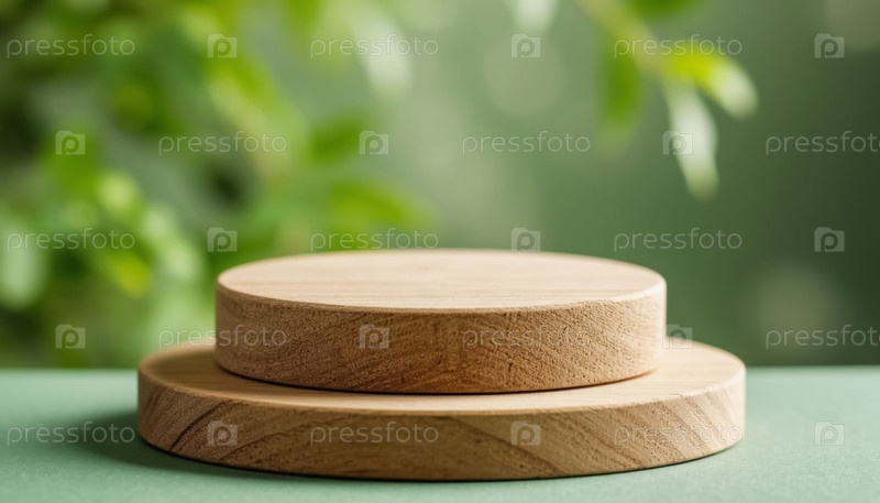 Деревянный подиум для презентации продукта на мягком зеленом естественном размытом фоне