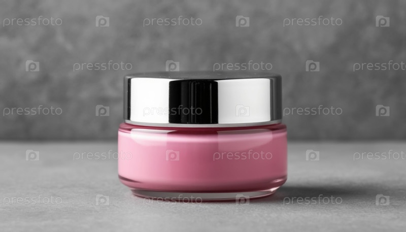 Банка розовой женской косметики с кремом на сером фоне