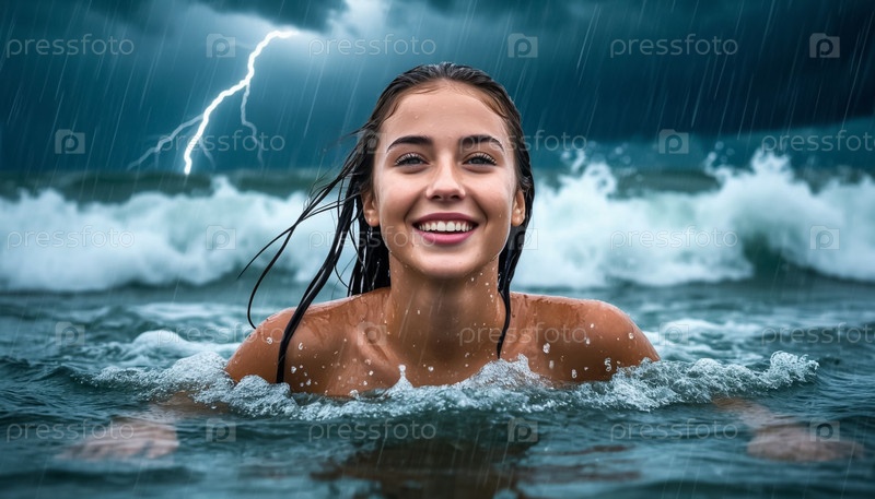 Красивая счастливая девушка с мокрыми волосами в море во время грозы и шторма