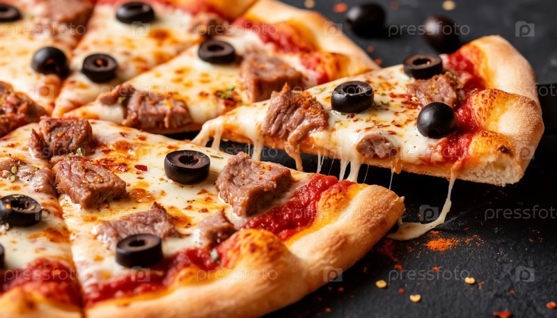 Мясо пицца с беконом крупный план на черном фоне писать без дополнений