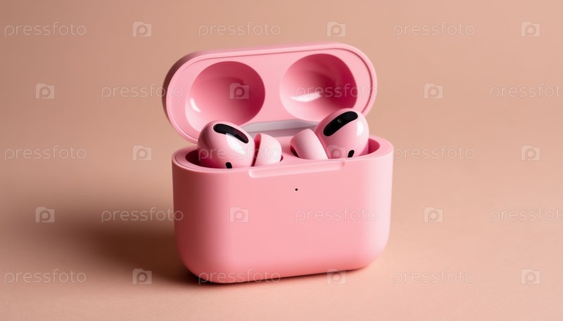 Наушники гарнитура для смартфона в коробке на пастельном фоне