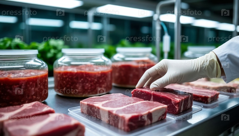 Рука взаимодействует с глютеном и безалкогольным растительным мясом, выращенным искусственно в лаборатории для веганов