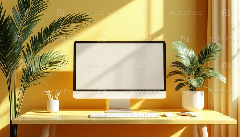 Мокет минималистского монитора в бледно-желтой обстановке