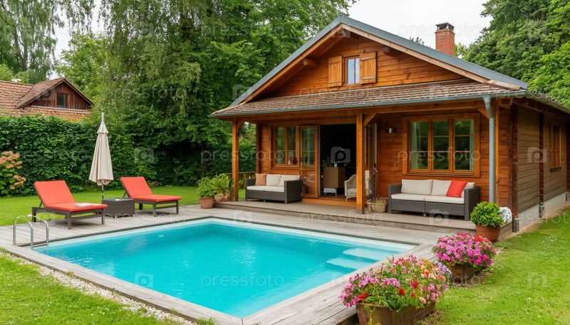 Небольшой деревянный коттедж с открытым бассейном во дворе