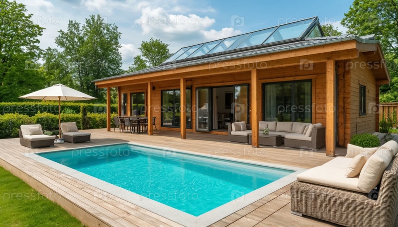 Роскошный деревянный коттедж с террасой и открытым бассейном во дворе