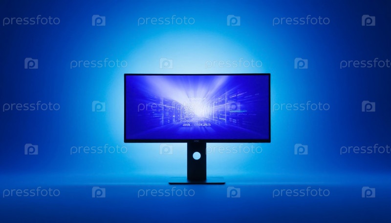 Монитор с Glowing Tech Screensaver на твердо-синем фоне