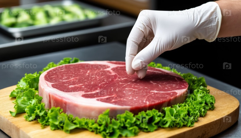 Рука взаимодействует с глютеном и безалкогольным растительным мясом, выращенным искусственно в лаборатории для веганов
