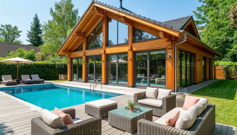 Роскошный деревянный коттедж с террасой и открытым бассейном во дворе