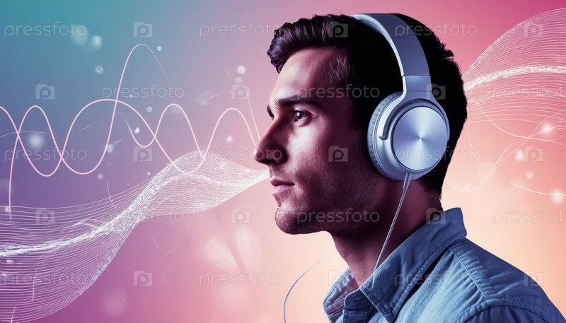 Мужчина в наушниках на пастельном абстрактном фоне с звуковыми волнами.Музыкальная обложка альбома