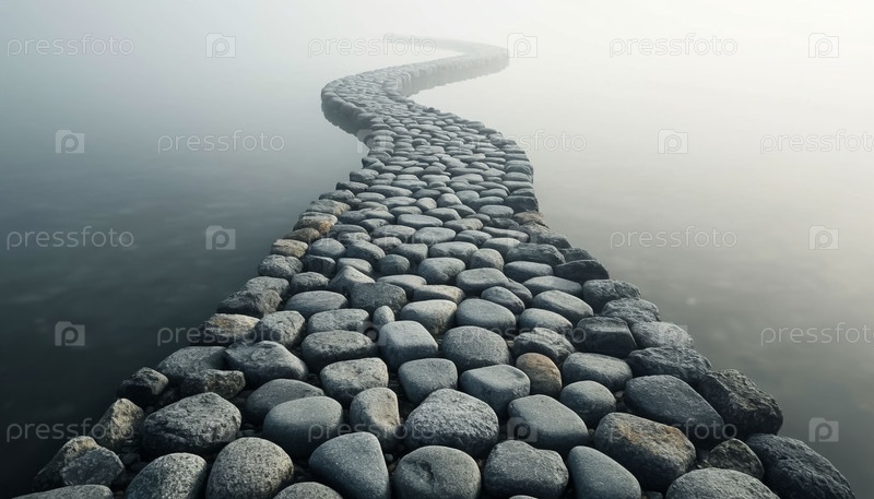 Извилистый каменный путь через чистую воду исчезает в тумане