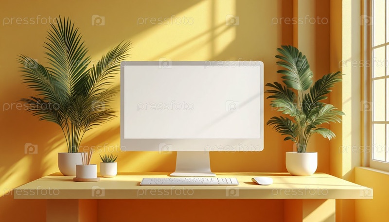 Мокет минималистского монитора в бледно-желтой обстановке