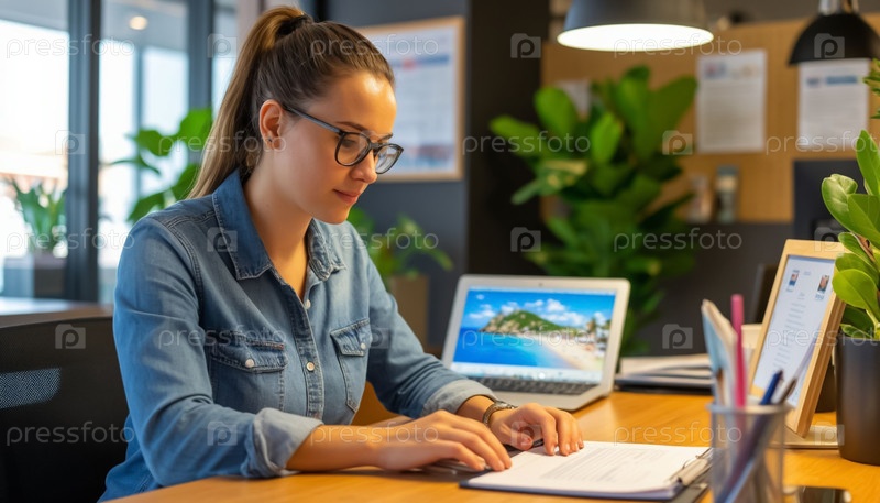 Молодая женщина работает в туристическом офисе, продавая туристические пакеты