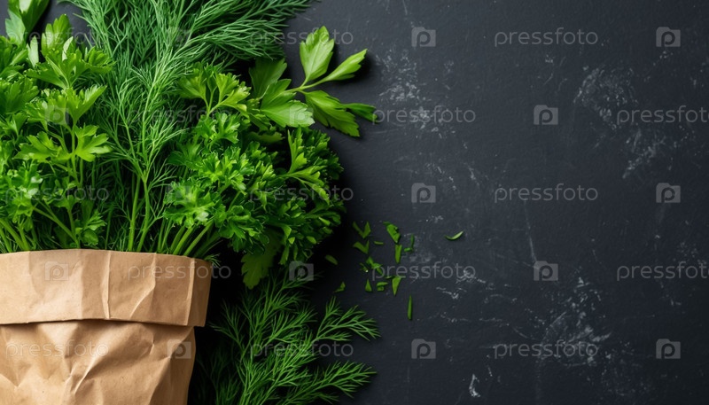 Свежие зелени уксуса, базилика и петрушки на черном фоне в ремесленной бумаге