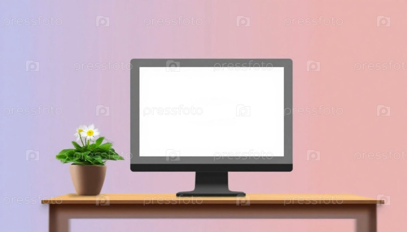 Установка чистого рабочего пространства с монитором и комнатным растением