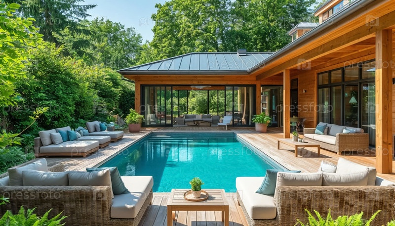 Роскошный деревянный коттедж с террасой и открытым бассейном во дворе