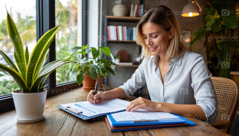 Молодая женщина работает в туристическом офисе, продавая туристические пакеты