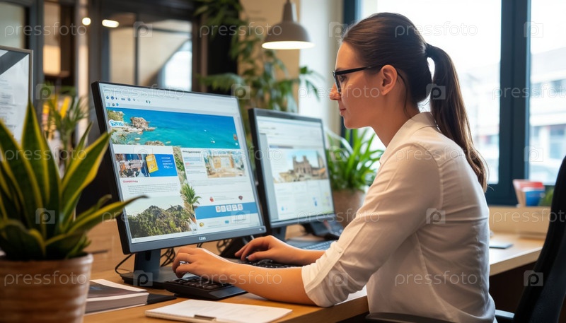 Молодая женщина работает в туристическом офисе, продавая туристические пакеты
