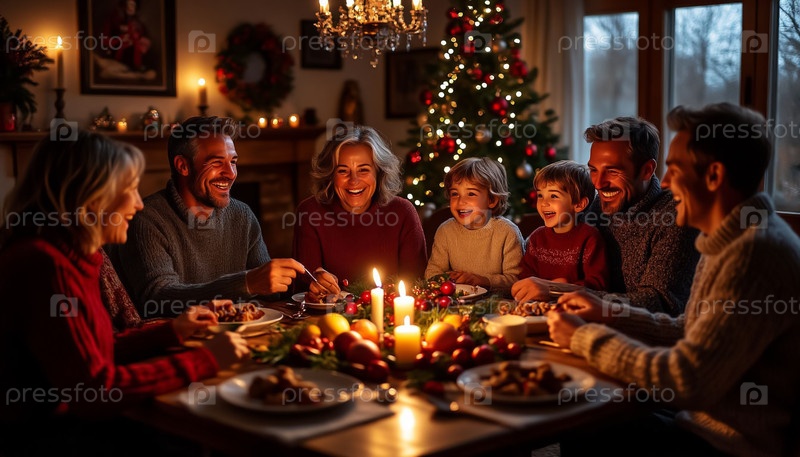 Большая счастливая семья, сидящая за рождественским столом
