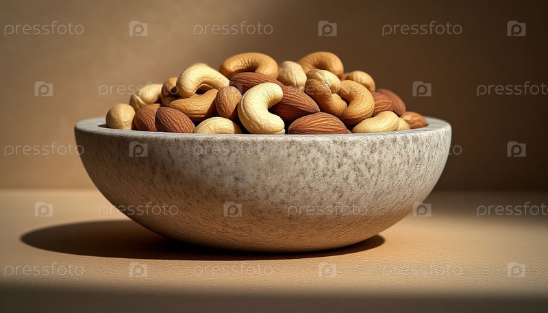 Каменная миска с орехами на теплом бежевом фоне