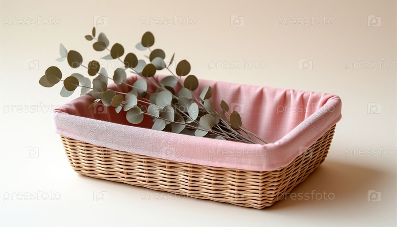 Прямоугольная тканеная корзина с розовой подкладкой из ткани и эвкалиптом