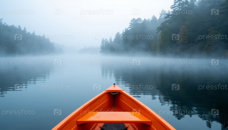 Оранжевая лодка посреди озера в туманное утро
