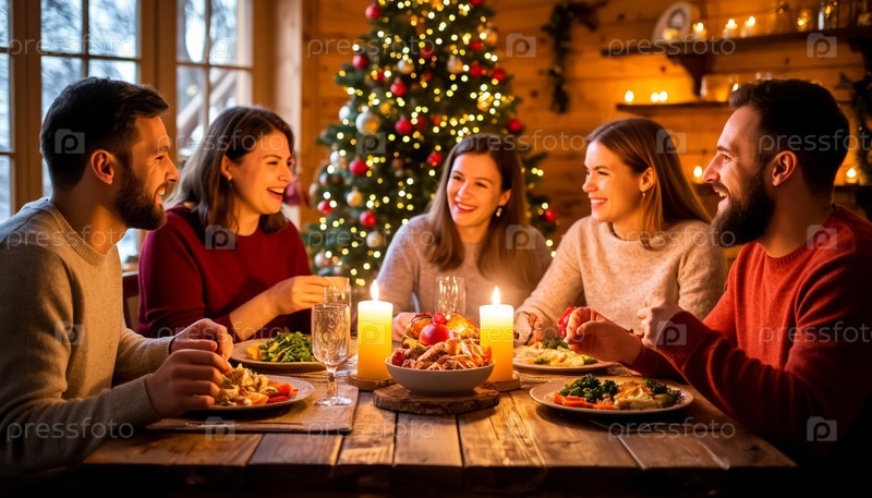 Праздничный рождественский ужин с улыбающимися родственниками AI