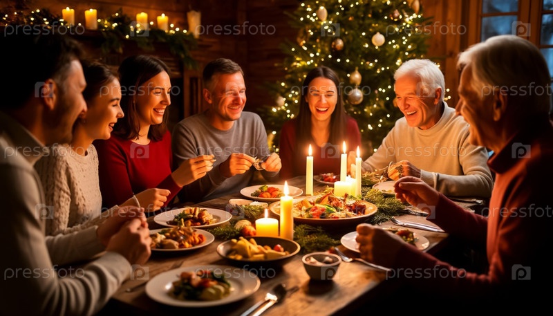 Праздничный рождественский ужин с улыбающимися родственниками AI