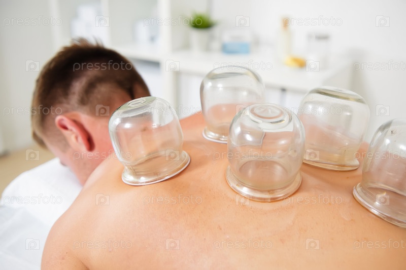 Вакуумные терапевтические массажные чашки на спине мужчины в кабинете врача