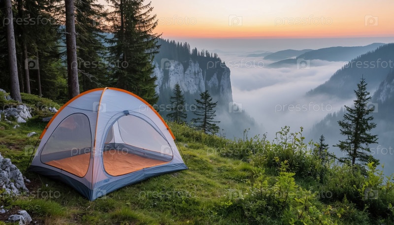 Туристическая палатка в горах, прозрачная, туманное утро и восход солнца над горами.Концепция отдыха и путешествия