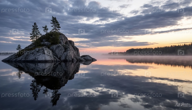 Озера Карелии и Финляндии, одинокий каменный остров посреди огромного озера