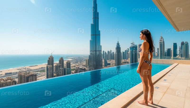 Девушка на краю бассейна с бесконечностью на крыше небоскреба