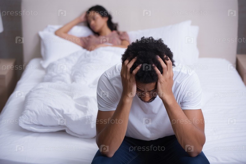 Раздраженный мужчина сидит на краю кровати с женщиной, закрывает лицо руками. концепция здоровья мужчин и проблемы с потенцией