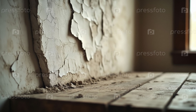Проветрившийся распад штукатурки на винтажном деревянном фоне