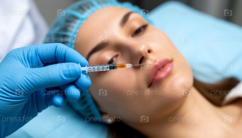 Инъекция красоты шприцем на фоне женского лица.Косметология и здоровье женщин