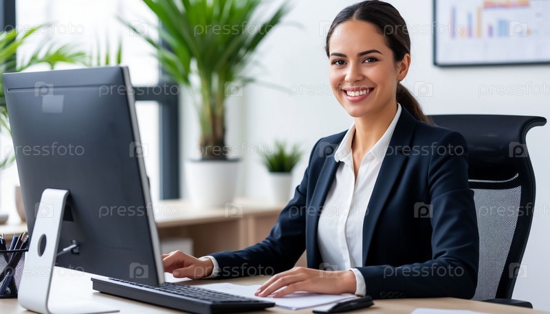 Деловая женщина молодая за компьютером в офисе, счастливо улыбающаяся