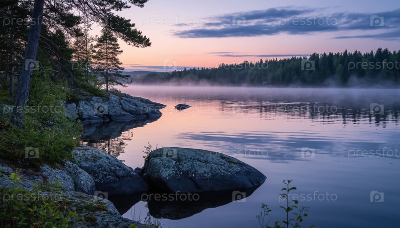 Утренний пейзаж, белые ночи в Карелии или Финляндии