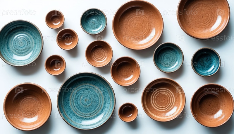 Набор керамической посуды ручной работы на столе с верхним видом