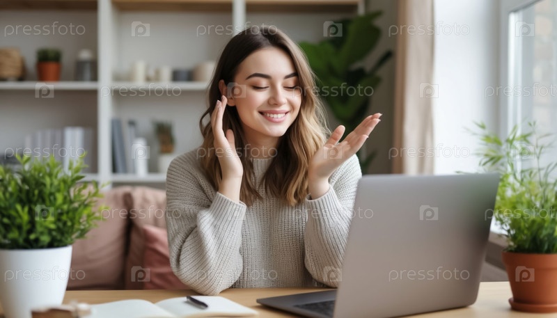 Счастливая молодая девушка или студент, сидящая перед ноутбуком, приветствует своего собеседника в Интернете воздушным поцелуем