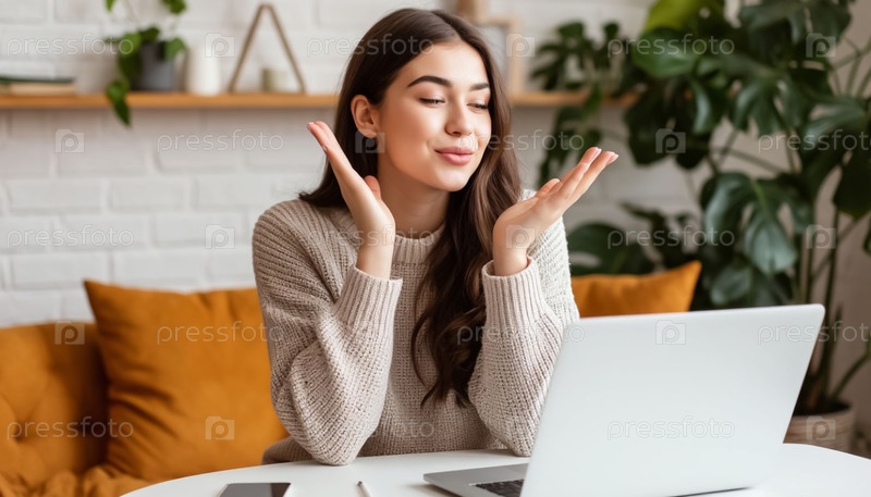 Счастливая молодая девушка или студент, сидящая перед ноутбуком, приветствует своего собеседника в Интернете воздушным поцелуем