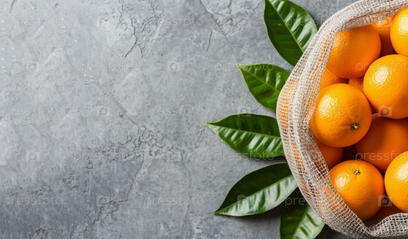 Апельсины в сетке на минималистическом фоне с копировальным пространством
