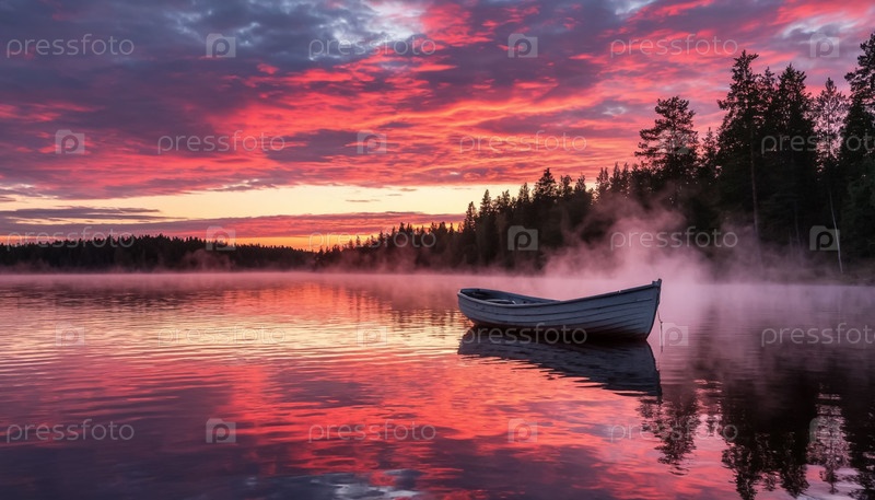 Розовый закат на лесном озере и одинокой лодке