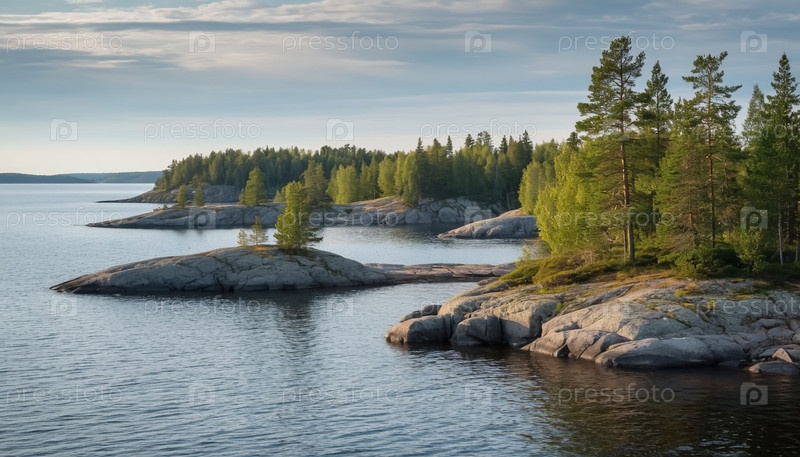 Водный ландшафт в Карелии или Финляндии. озеро, скалы, ель. отражение в воде